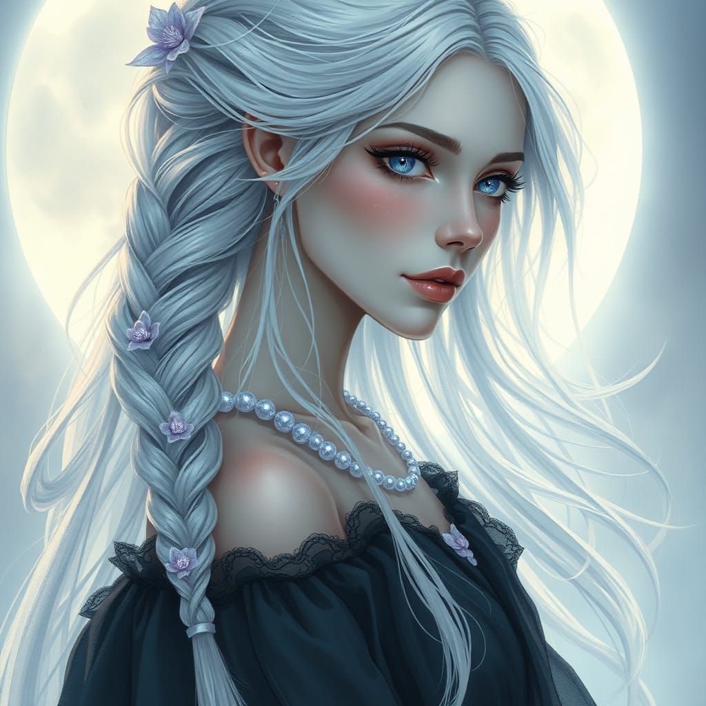 This enchanting image depicts a mystical sorceress standing in lunar light, surrounded by an otherworldly aura. Her silver hair cascades down her back, adorned with glowing flowers, while her deep violet eyes hold secrets of the night. Attired in a flowing black gown, she embodies a connection to the mys...