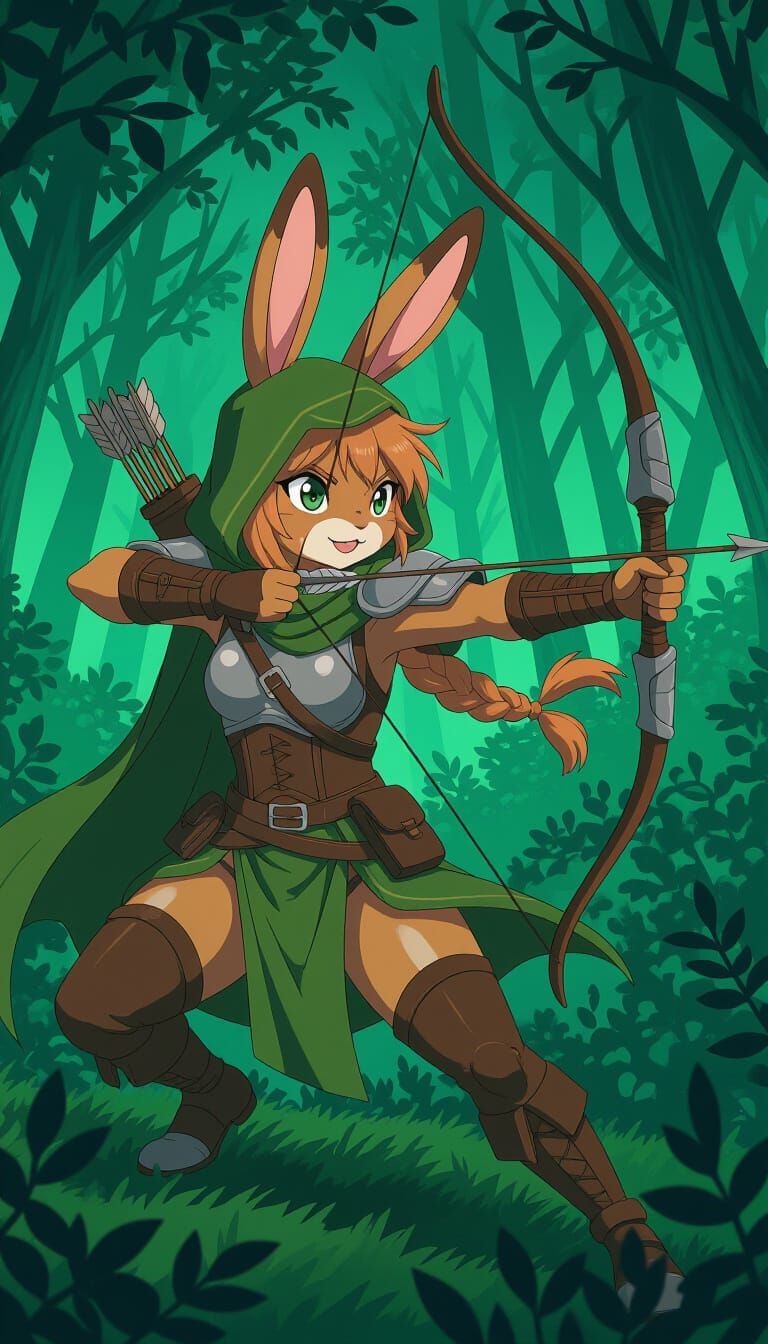 A female anthropomorphic rabbit warrior in leather armor and a cloak sneaks through a twilight forest, bow drawn. Rendered in a cel-shaded anime style with deep colors.