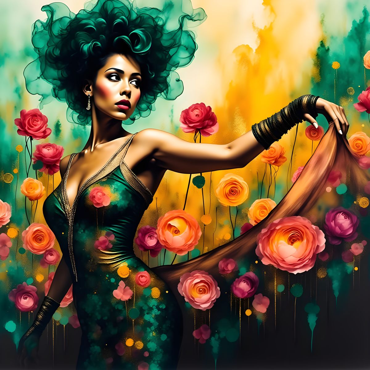 This striking image depicts an Afrofuturist showgirl adorned with roses, presented in a 1920s cabaret poster art style with German Expressionist influences. Created using watercolors and acrylics.