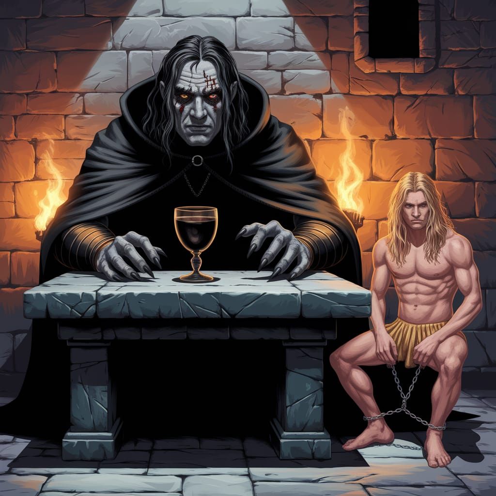 This image shows a dark, imposing figure in a medieval castle, surrounded by the eerie glow of torchlight and the contrast of a striking, shackled figure in a golden skirt. The dark figure's intense gaze and weathered face are shrouded in mystery, adding to the somber atmosphere.