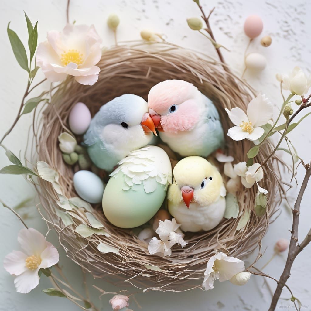 Today we drift into a gentler palette. Delicate, powdered, and quietly joyful. Nature’s own pastels appear in the soft blush of a lovebird’s plumage ([i]Agapornis[/i]) and in the dreamlike hues of painted eggs nestled in sun-dappled ...