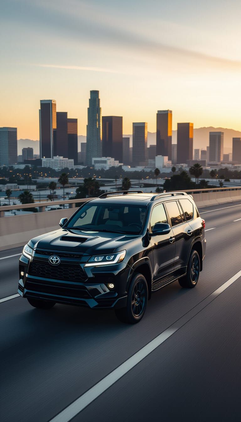 This image shows a sleek black Toyota Land Cruiser Mini GR Sport speeding along a Los Angeles freeway during sunset. The cityscape is visible in the background, rendered with hyperrealistic detail.
