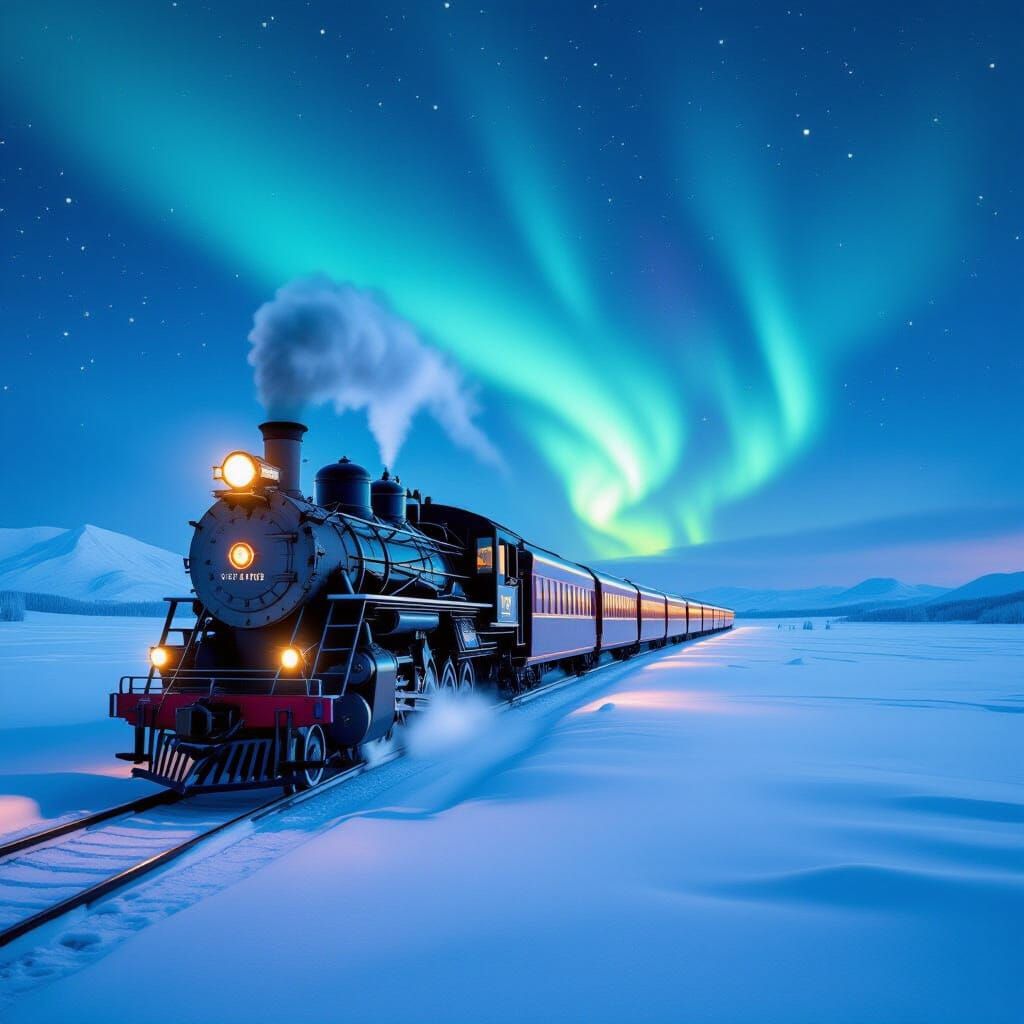 An antique, ornate train carriage, its interior glowing with a warm, inviting light, glides silently across a vast, frozen tundra under a sk...