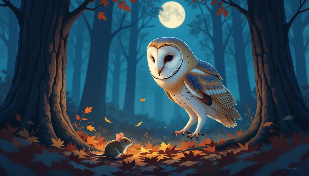 This image captures a barn owl in silent flight through a cool-toned, moonlit forest. Dramatic lighting highlights its hunt for prey among fallen leaves.
