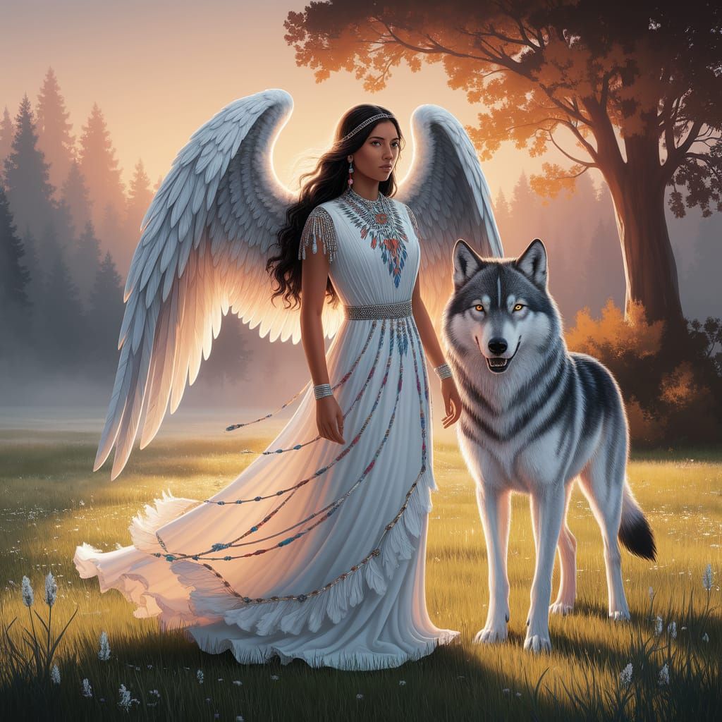 This image shows a Native American angel in a sunlit meadow, wearing a beaded white dress and feathers. A golden-eyed wolf stands beside her protectively in this scene of serene beauty. The artwork has soft, misty forest background.