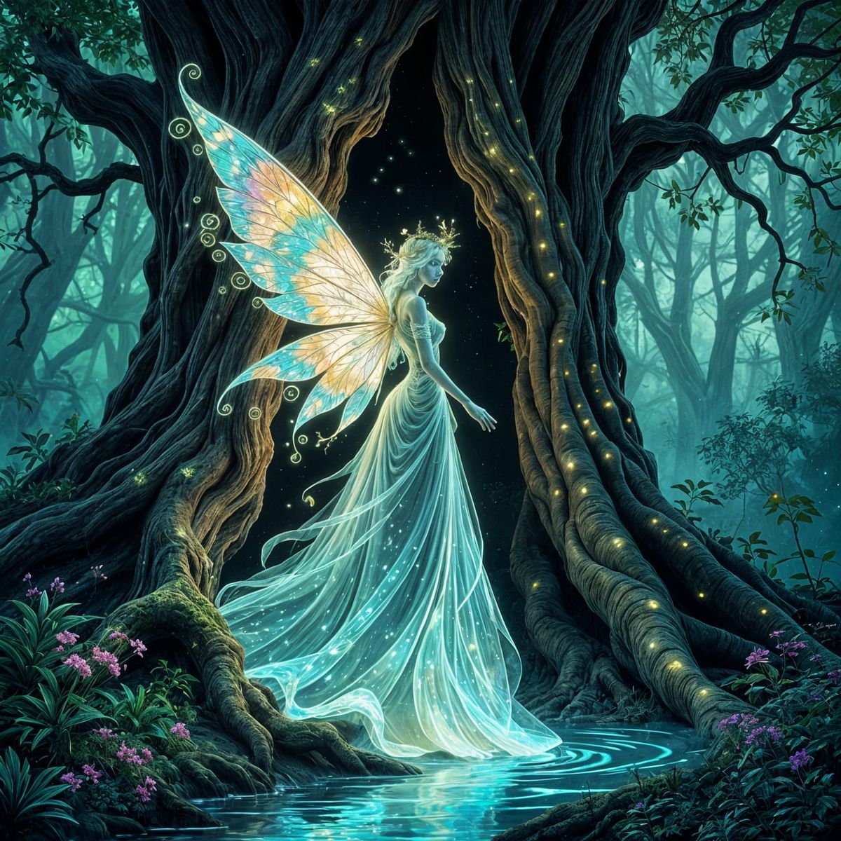 This image shows a fairy queen made of smoke and stardust coming out of a portal in a redwood tree. Her wings shine with many colors, and the forest has glowing moss. Digital art inspired by cosmic surrealism.