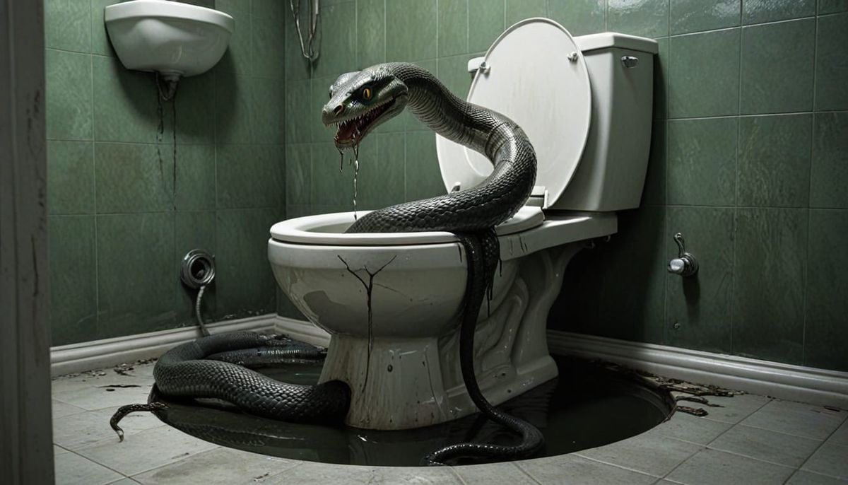 A close-up of a snake emerging from a toilet bowl, set against a backdrop of filthy bathroom tiles and eerie fluorescent lighting, rendered in detailed matte painting with oil painting textures.