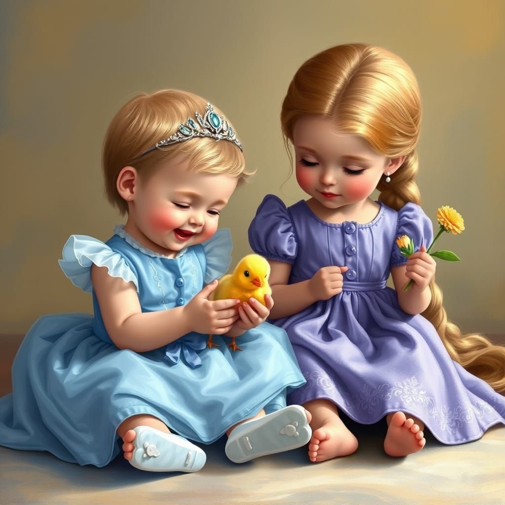 This image shows baby Cinderella and Rapunzel together in a realistic, heartwarming scene. Cinderella is playing with a chick, while Rapunzel curiously holds a flower, all rendered with soft textures and golden lighting in a classic storybook art style.