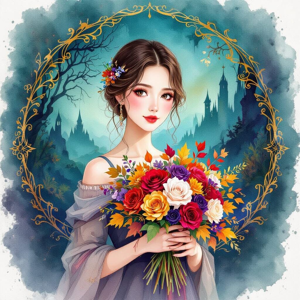 This image showcases a young woman holding a colorful autumn bouquet against a mysterious fantasy backdrop. Rendered in a soft watercolor style with coffee textures, it features rich turquoise, gold, and purple tones.