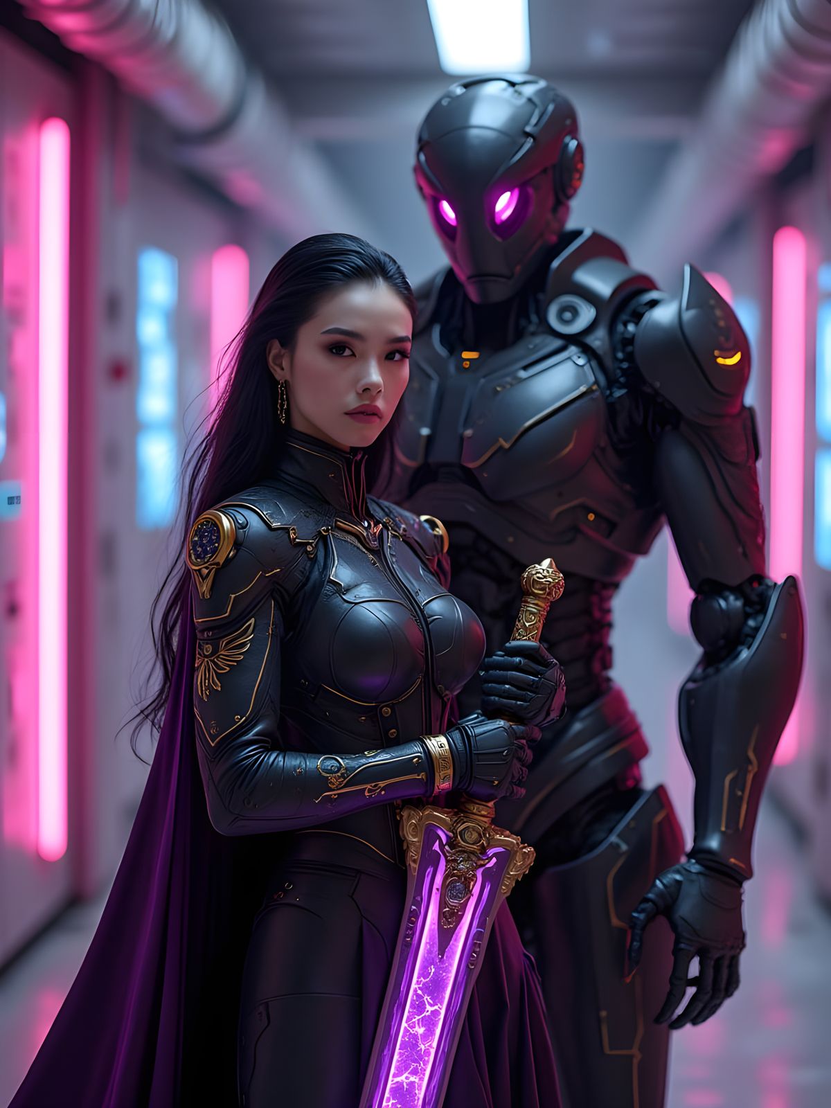 A powerful cybernetic queen in an ornate black and gold exosuit stands assertively in a neon-lit corridor, holding a glowing violet energy sword.