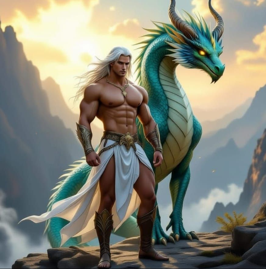 This image depicts an epic fantasy scene of a divine, winged warrior with silver hair standing beside his majestic, iridescent spirit dragon. Bathed in dramatic golden-hour lighting, the scene exudes power and allure.