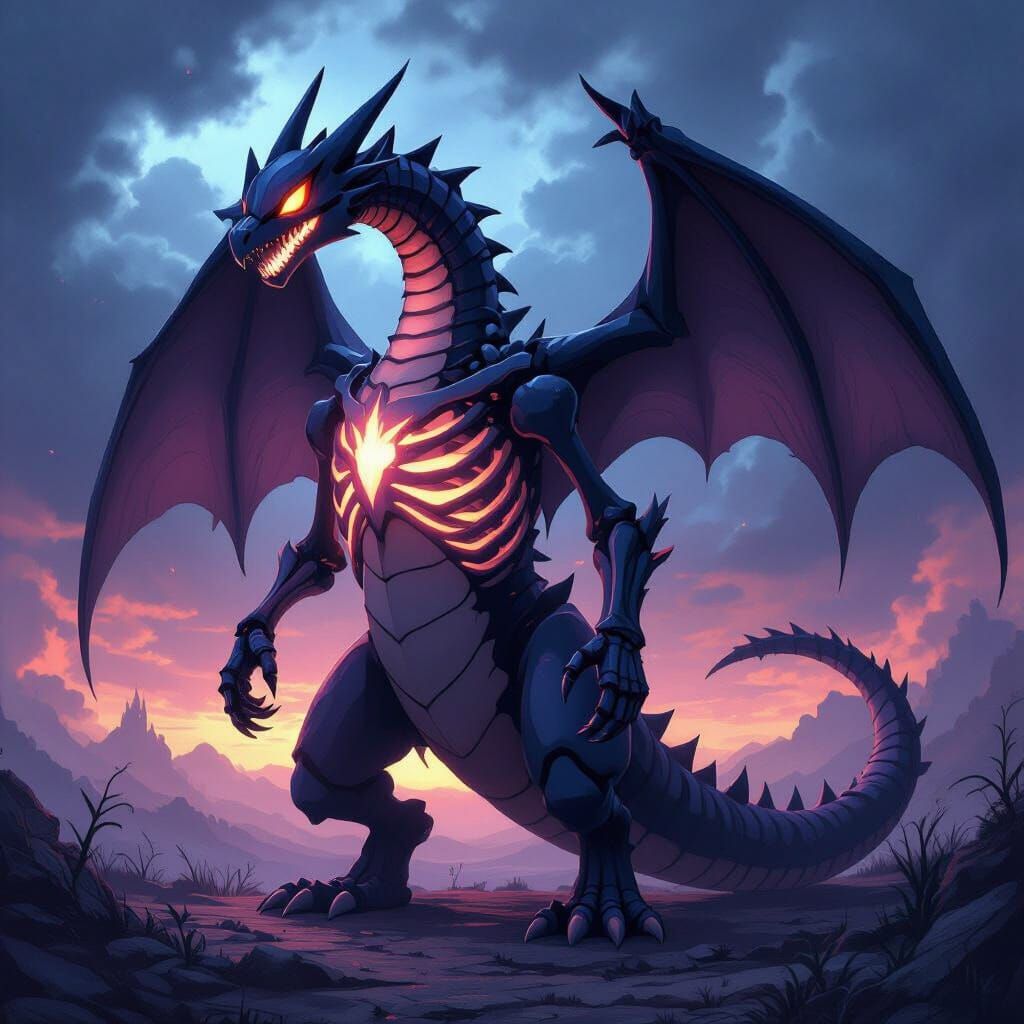 This image shows a skeletal Charizard glowing with ethereal energy, depicted in a dark, gothic fantasy art style. Dramatic lighting and vivid desaturated colors create a macabre and grand atmosphere.