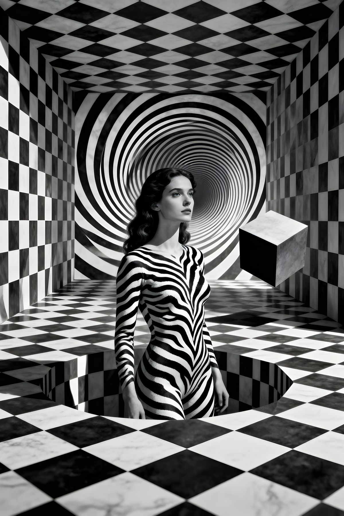This image shows a woman with zebra-striped skin blending into a monochrome labyrinth of impossible geometry. Rendered in a hyperrealistic, surreal op-art dreamspace style with high-contrast lighting.