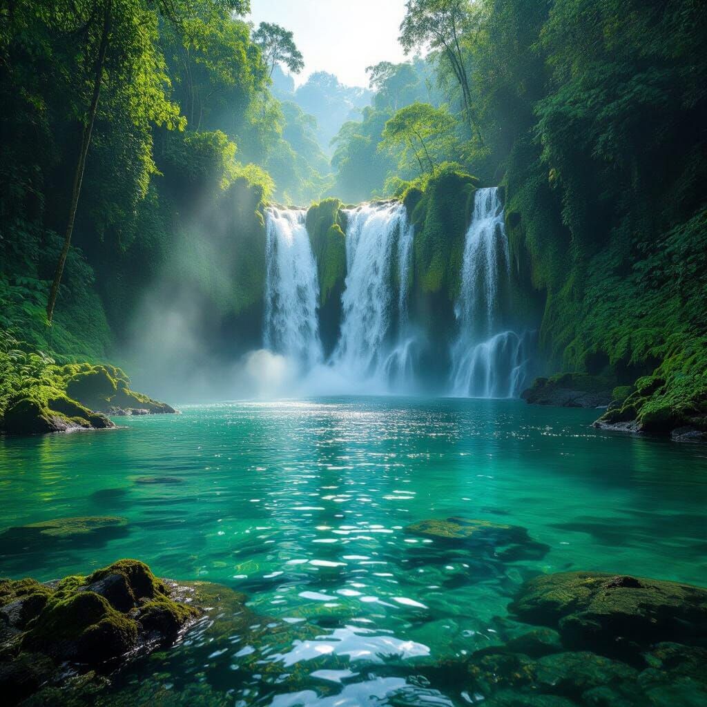 A hyper-realistic nature photograph captures a majestic waterfall plunging into a clear lagoon, surrounded by vibrant jungle. Soft light highlights the mist and water.