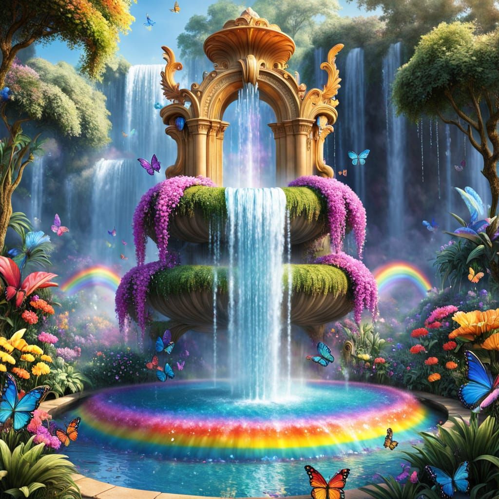This image features a magnificent fountain in a magical garden, with water cascading in vibrant rainbow hues. Crystal butterflies flutter around the enchanting scene.