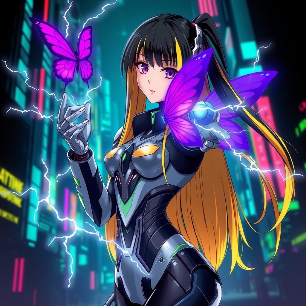 A striking image of a cyberpunk anime girl villain wearing a sleek mech suit, controlled by a mysterious purple butterfly, set against a futuristic cityscape backdrop with neon-lit accents.