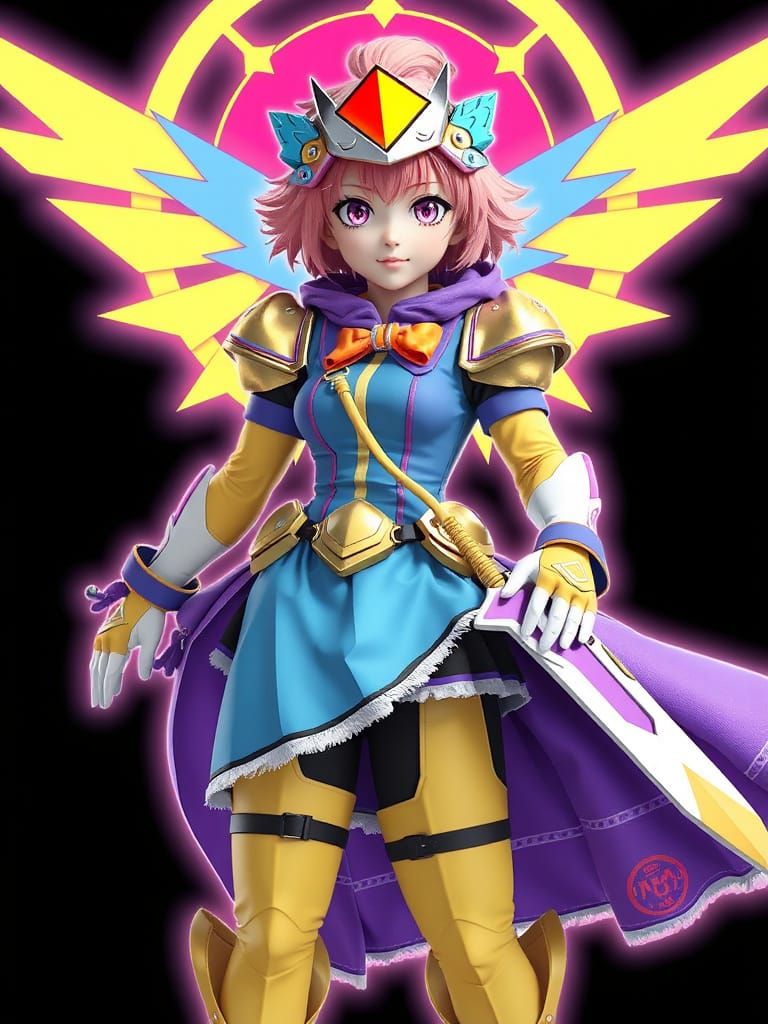 This image shows a heroically posed anime woman with vibrant, spiky hair, wearing a detailed costume and replica weapons. The image has a 3D anime art aesthetic in the style of Genshin Impact concept art.