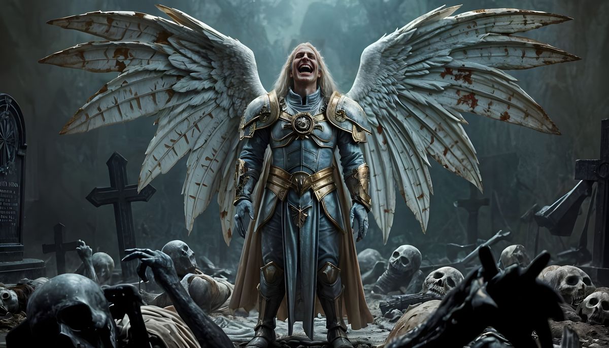 This image shows a white and gold armored Angel of Death laughing in a graveyard filled with corpses. Large, dirty white wings complete the hyperrealistic, cinematic scene.