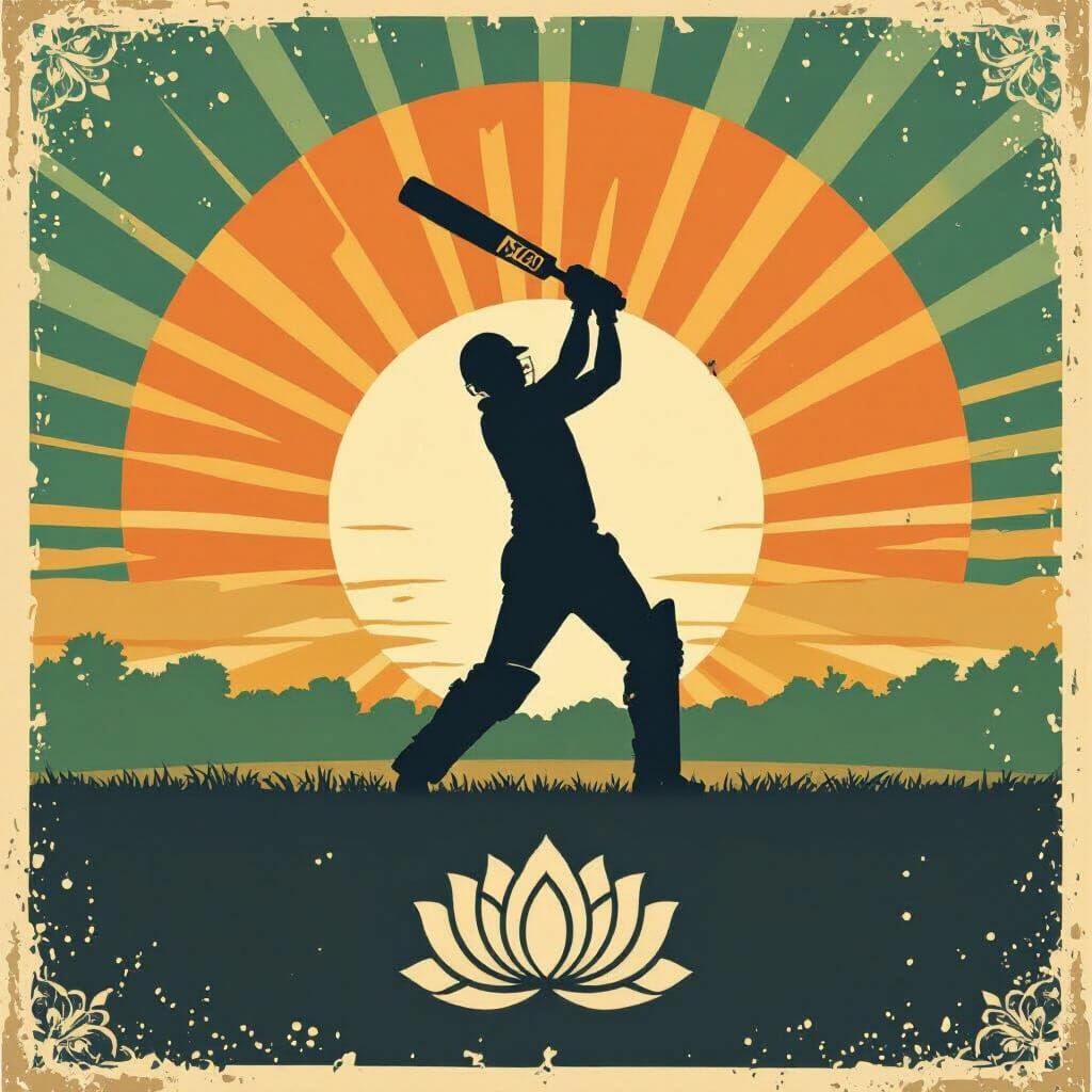 This vintage-style poster captures a cricket batsman's silhouette against a rising sun, incorporating Indian flag colors and gold accents in an engraving style.