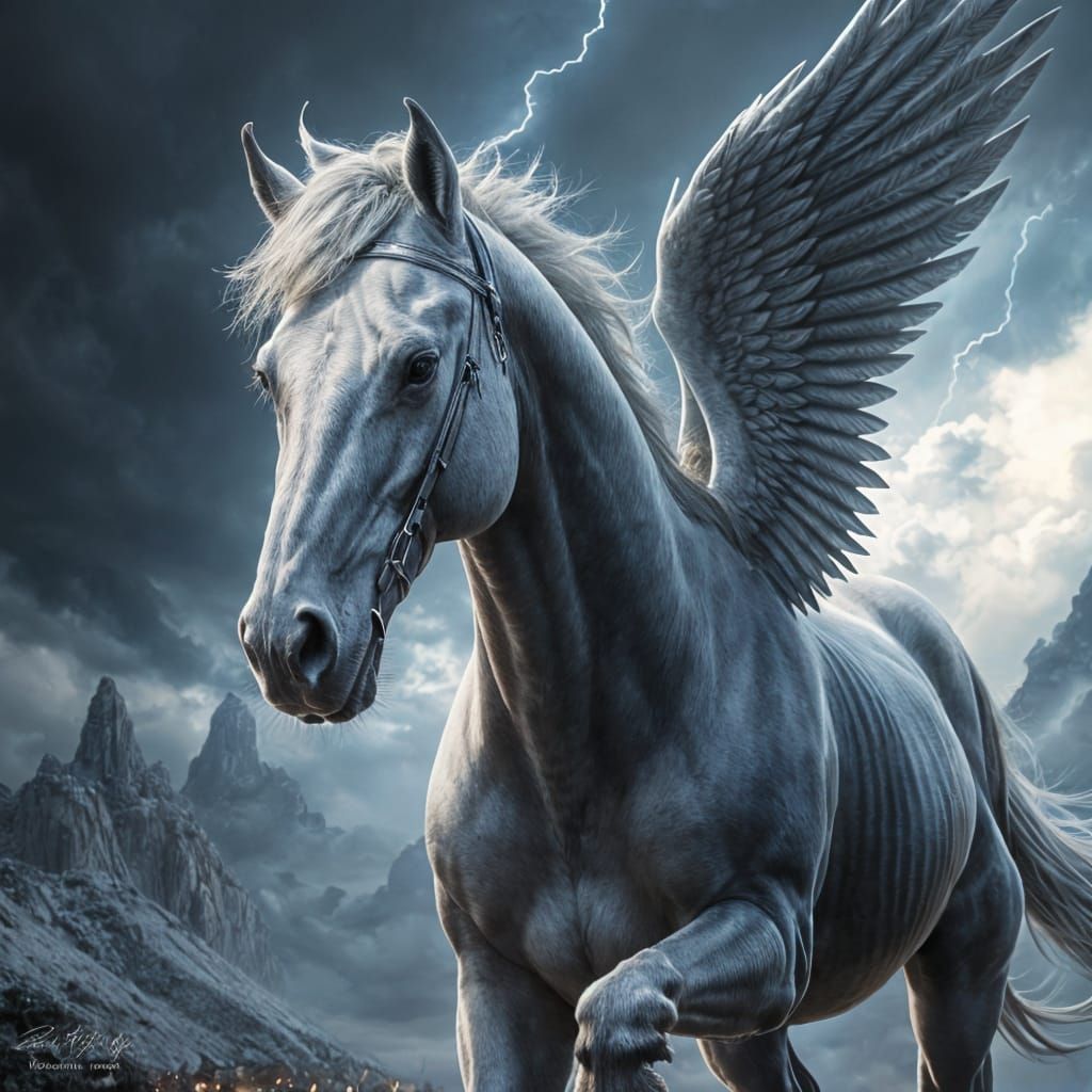 This image shows a powerful, winged horse with a striking silver coat and electrifying mane, evoking the energy of a turbulent storm in a fantasy art aesthetic.