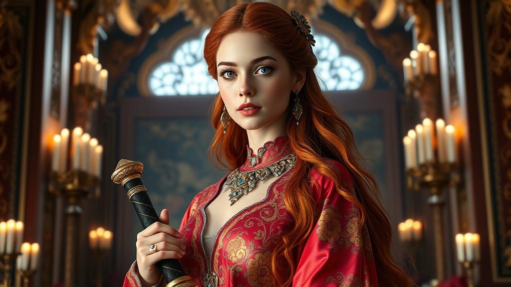 A photorealistic image of a beautiful princess with long red hair in a silk gown. She stands in a grand palace holding a sword, illuminated by dramatic, volumetric lighting.