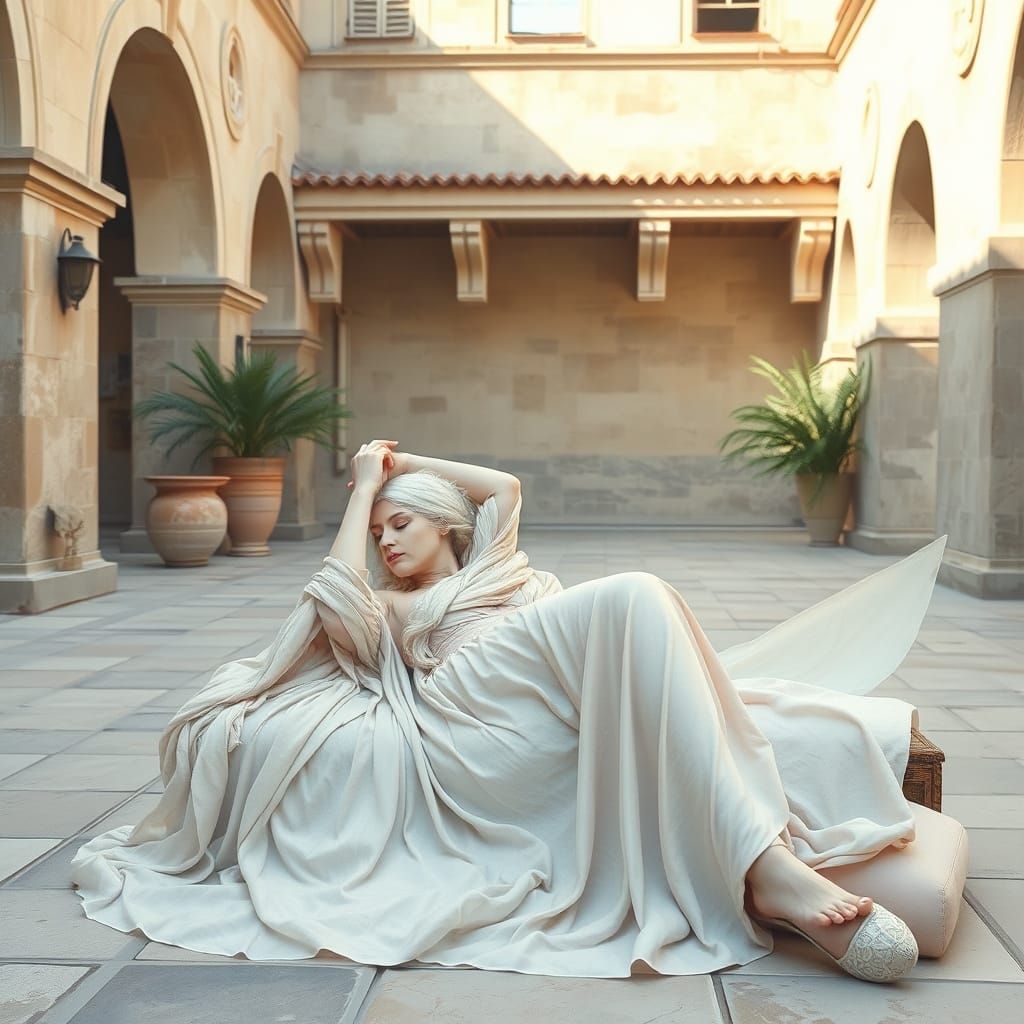 This image shows Aphrodite in a tranquil courtyard. She is draped in silk robes and bathed in soft light, rendered in delicate watercolor style with subtle colors and fine details in a dreamy aesthetic.