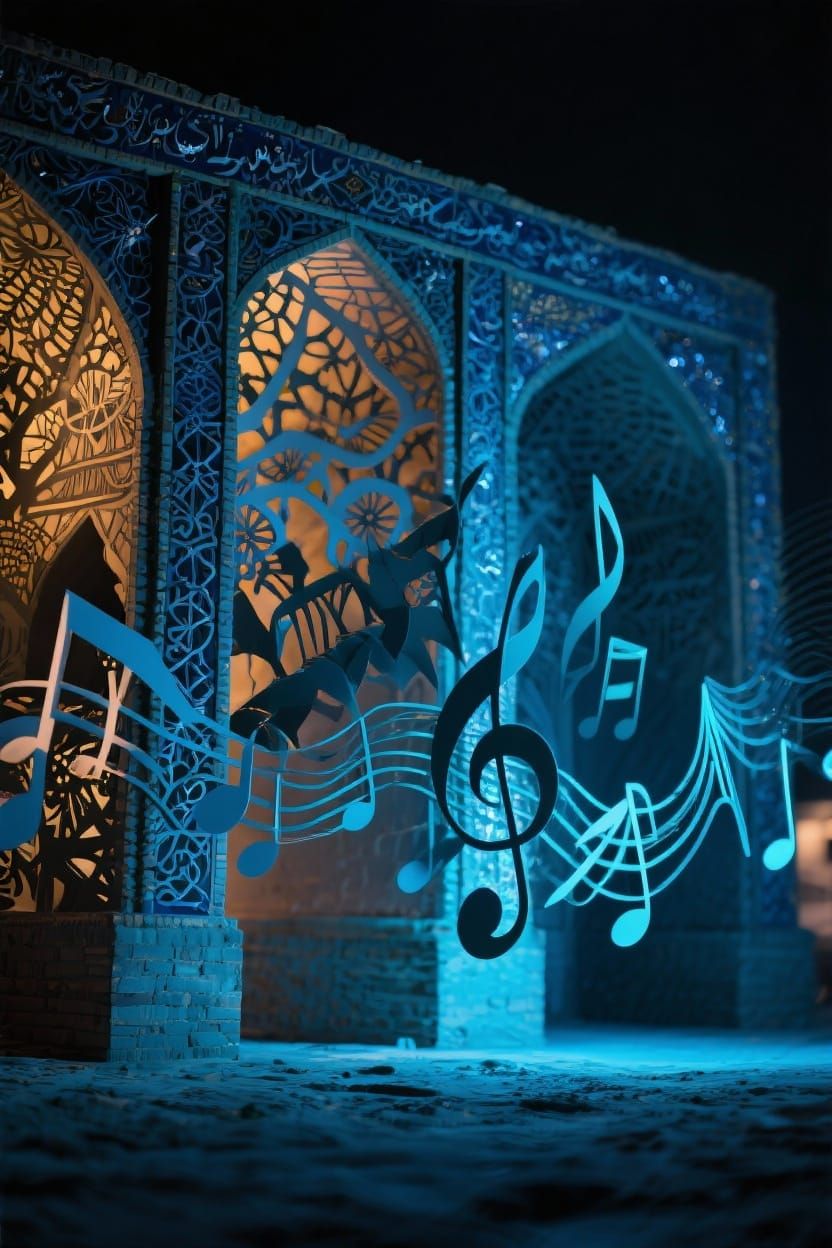 sonorous joy in subdimensionality by artist print music kirigami by artist architectural fragment by artist dramatic dynamic textural lighting by artist mechanical infrared fractal by photographer Siosepol Isfahan oil slick terrestrial underlit landscape absolutely no text should appear in this image ...