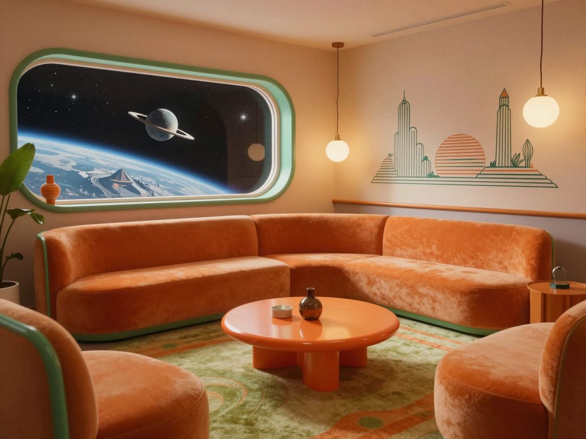 This image depicts a 70s retro-futuristic living room featuring curvy orange furniture, a Nuevo coffee table, and hanging lamps. A window reveals an outer-space vista, complementing the orange and green decor.
