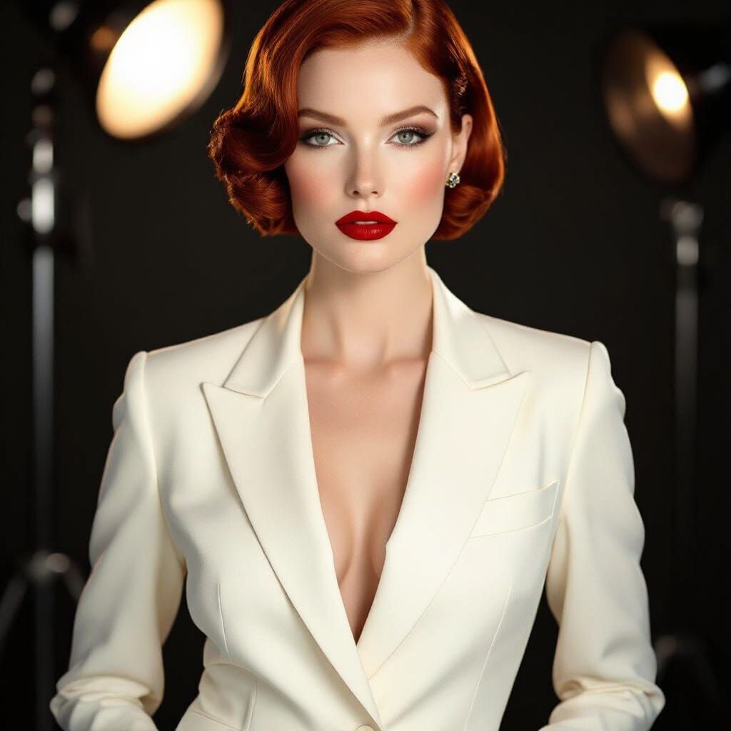 This image shows a red-haired woman with porcelain skin in a 1920s-style bob. She wears a designer pantsuit, ruby lipstick, and smoky eye makeup, set against a dark background with dramatic lighting, in a photorealistic Vogue-style editorial.