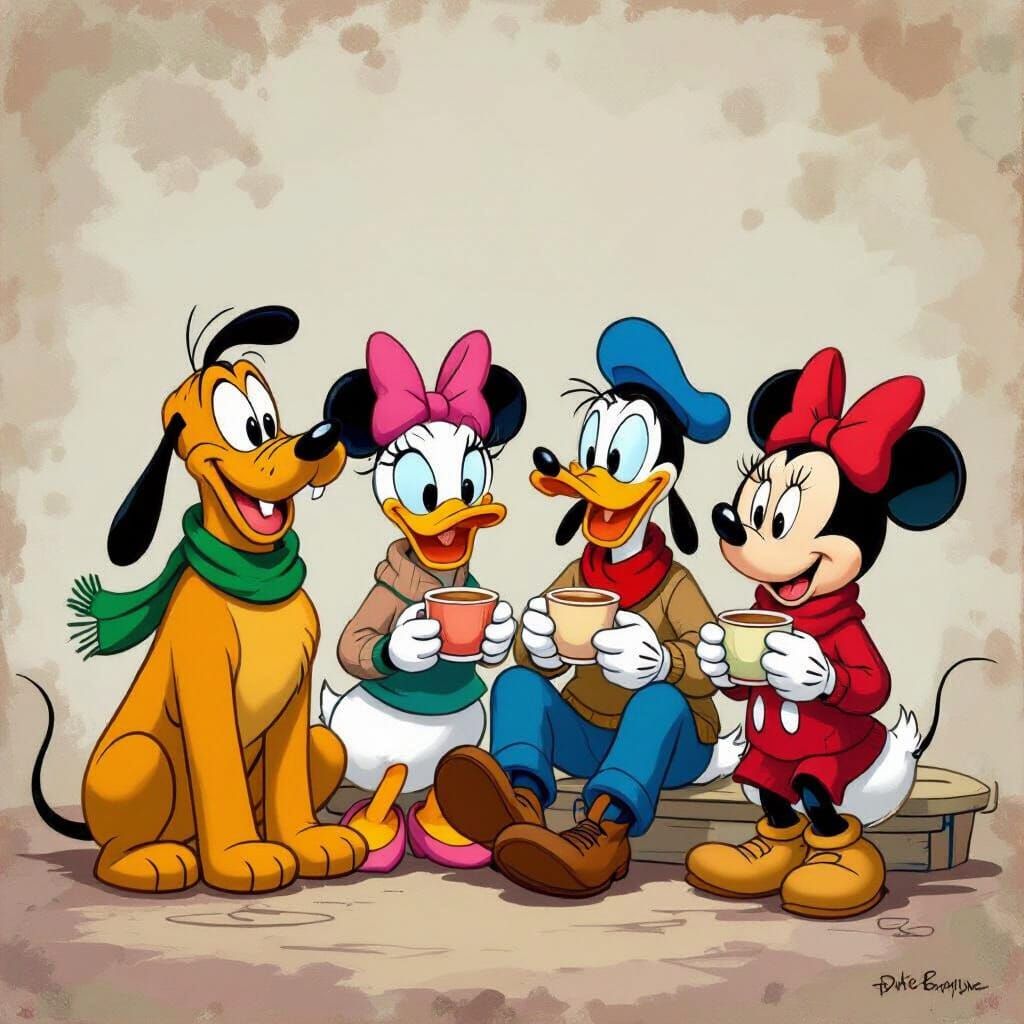 This image shows classic cartoon characters enjoying a coffee break. Minnie Mouse, Mickey Mouse, Daisy Duck, Donald Duck, Goofy, and Pluto are depicted in a whimsical style.