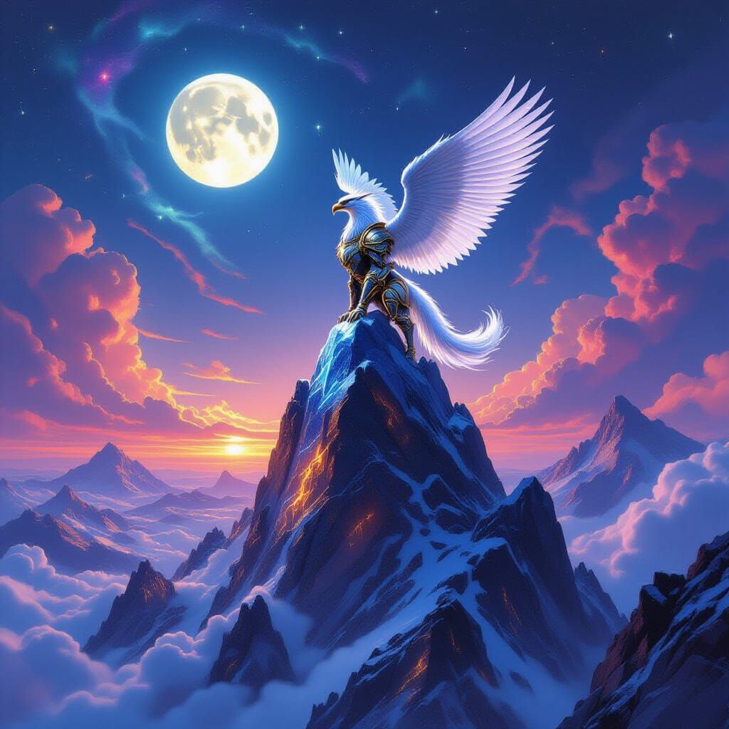 A majestic griffin in ornate armor surveys an alien world from a crystal mountain under two moons. Features a vibrant nebula and glowing runes, rendered in epic fantasy concept art style.