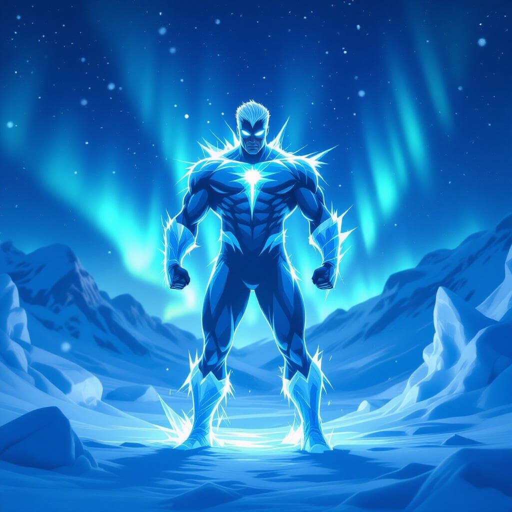 This image shows the X-Men's Iceman, formed of ice and radiating cold light, at the North Pole. Snow, ice formations, and the aurora borealis create a dramatic, ethereal scene in a vivid digital matte painting style.