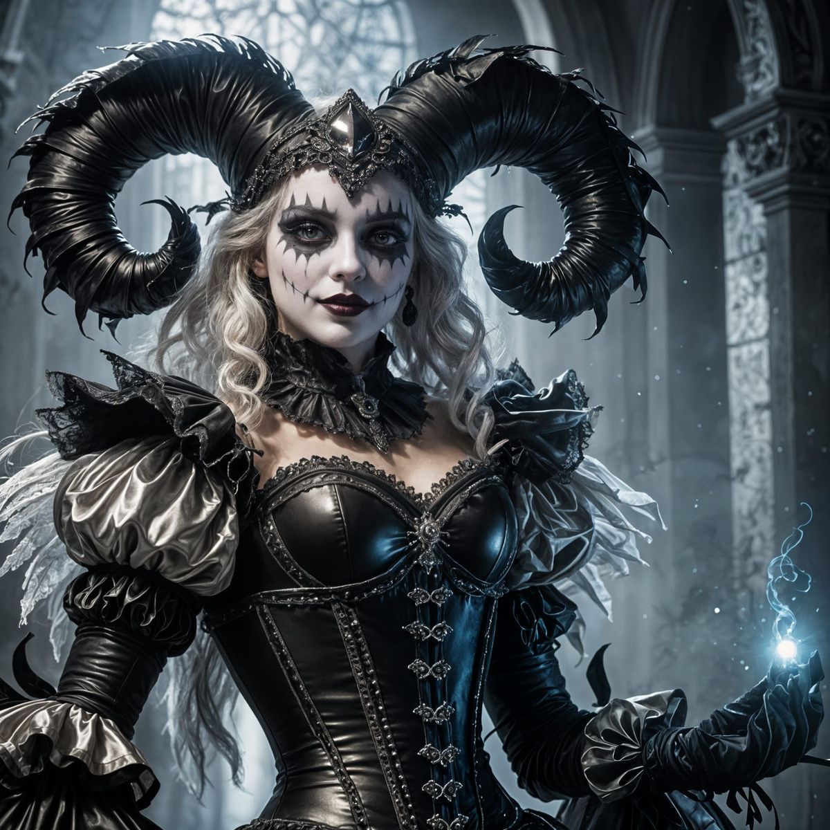 A captivating close-up of a female jester with a porcelain face and glowing eyes, set in high-contrast lighting. The image showcases a dark fantasy aesthetic with sharp focus and atmospheric shadows.