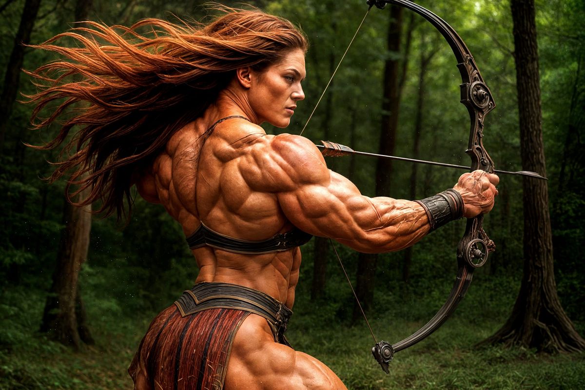 This image shows a powerfully built female archer in Roman-style MMA attire, flexing her immense muscles. The photograph captures her from behind in a lush forest, highlighting her physique in vivid colors.