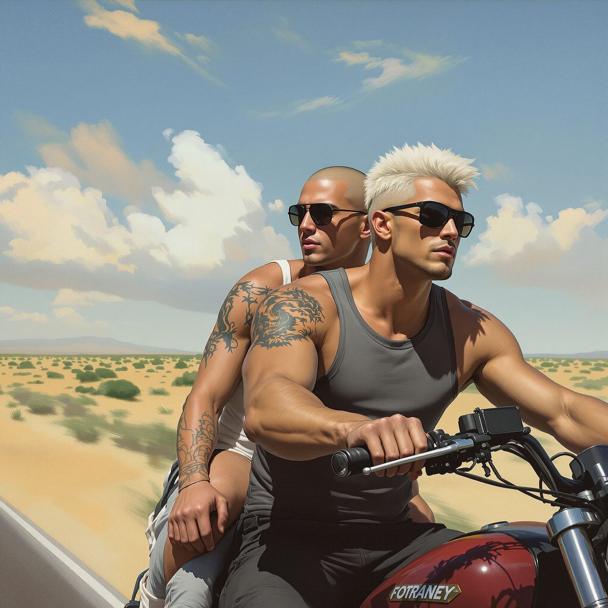 This oil painting depicts two young men on a motorcycle. The driver has a shaved head and dragon tattoo, while his passenger has bleached white hair, both wearing sunglasses.