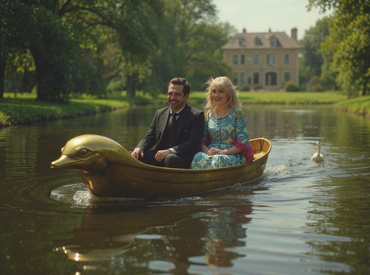A brass steampunk boat resembling a dolphin travels a sunlit English river. A Victorian couple enjoys the scenic view near a manor, with ducks nearby. Cinematic film still.