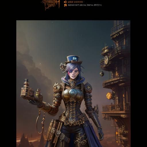 This image shows a highly detailed steampunk robot woman. The digital painting features intricate details, deep color, and complementary colors in a fantasy concept art style.