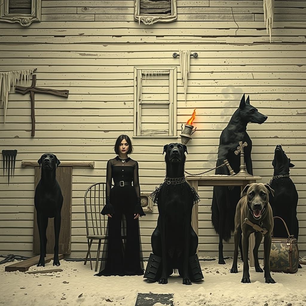 A goth fashion model stands in a foggy, decaying house, with giant dogs and volcanic ocean waves outside. Accents of rusted iron and red neon light create a stark, high-contrast scene.