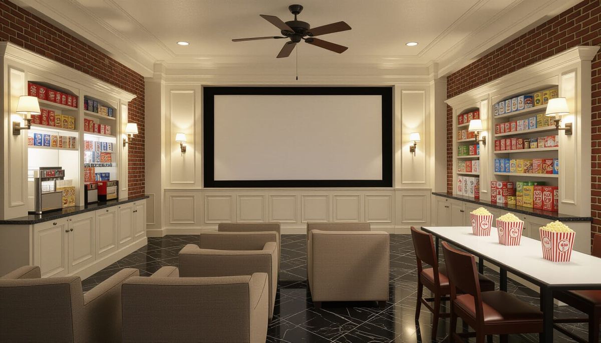 This photorealistic image depicts a vibrant Victorian movie theater room. Ivory cabinets display snacks and drinks, with a wide-angle screen and plush seating on a black marble floor. Cinematic lighting creates a warm glow.
