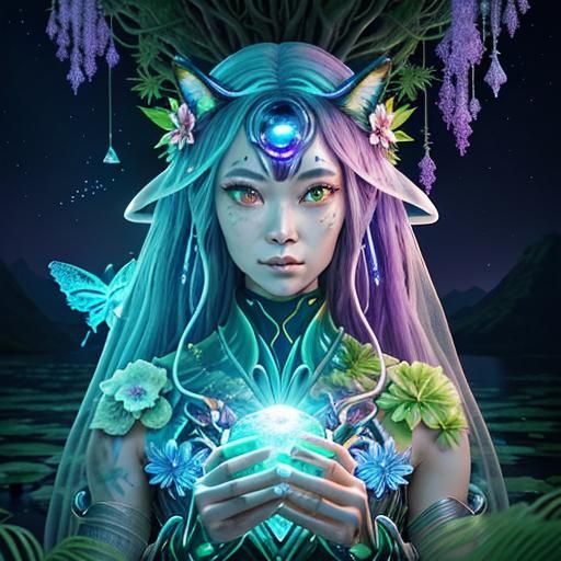 This image showcases a biopunk cyborg fox goddess in a neon laboratory. The fox is adorned with cyborg flora and fauna, set against a backdrop of surreal landscapes and alien flora.