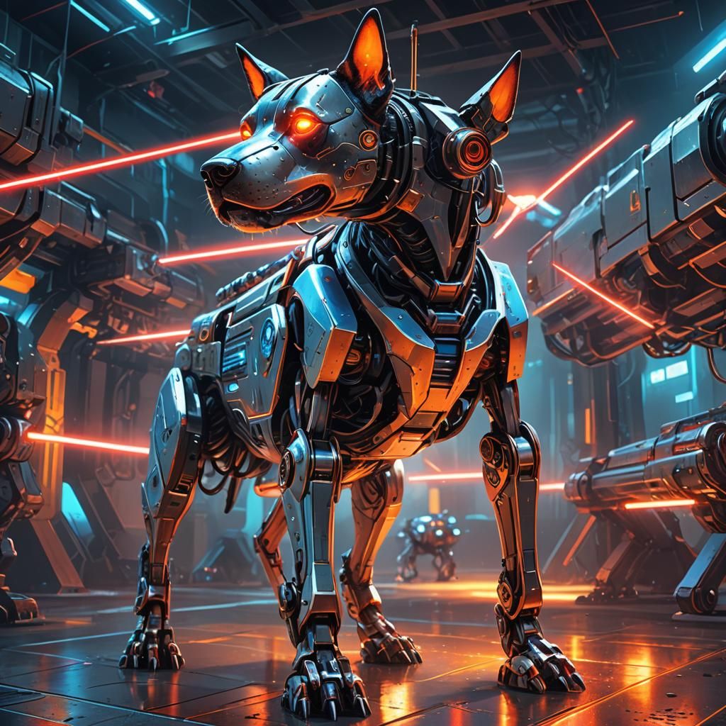 A striking picture of a robotic dog unleashing laser fire. The dog stands on a metallic walkway amidst a futuristic backdrop. The image is rendered as high-energy vibrant digital art.