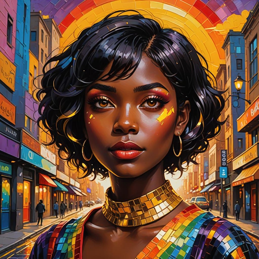 This image shows a stunning anime-style portrait of a confident, dark-skinned woman with bold makeup and opulent jewelry, set against a colorful backdrop of rainbows and deep shadows, blending neo-impressionist and expressionist styles.