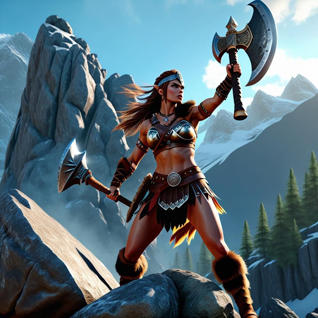 This image shows a fierce female barbarian standing triumphantly atop a mountain crag. She is in a fighting pose, with her battle axe raised high against a backdrop of dynamic lighting.