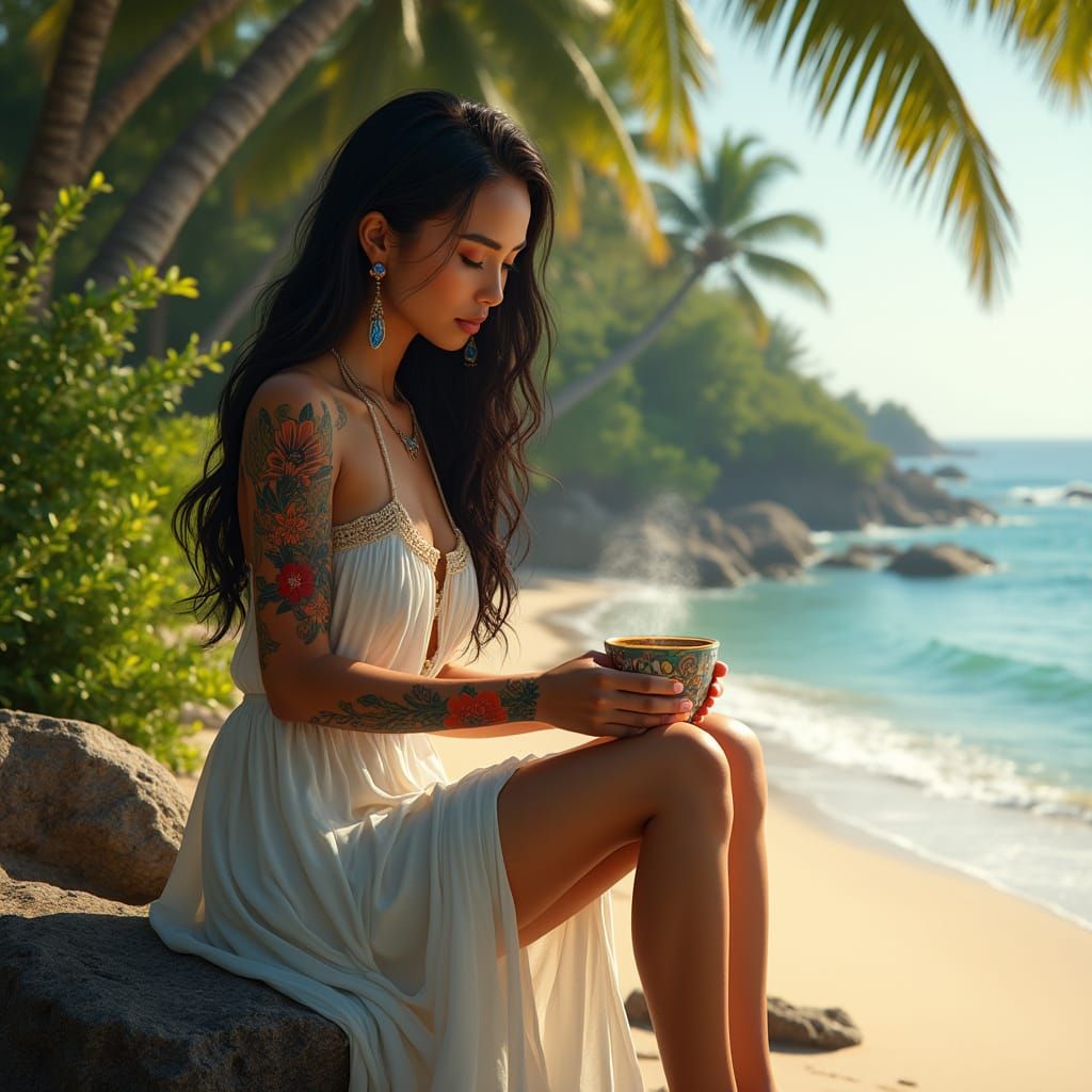This image shows a serene Polynesian woman sitting on a beach rock, cradling a cup of coffee, surrounded by palm trees and the soothing sound of waves, in a style inspired by the works of Paul Gauguin and James Jean.
