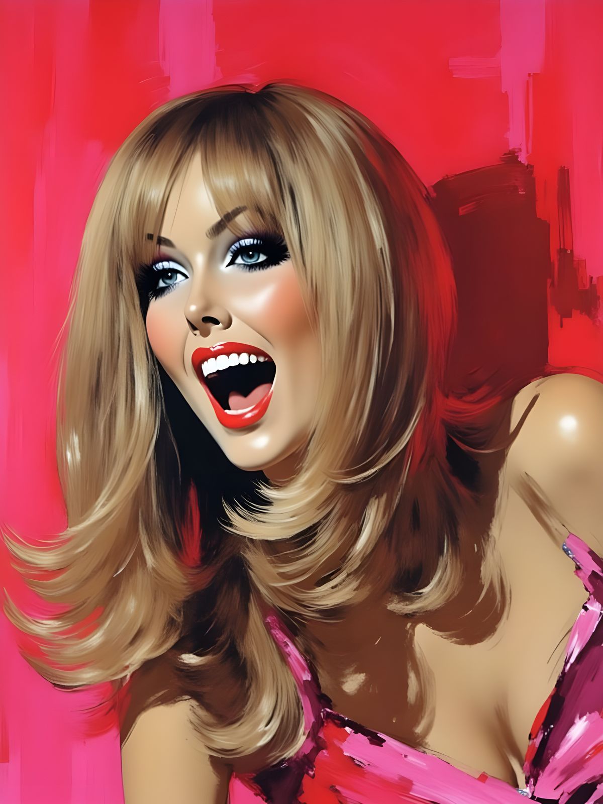 This image shows a happy blonde woman in a 1960s lounge setting. The abstract impasto style uses vibrant colors, bold brush strokes, and 3D textures to create a dynamic and expressive portrait.