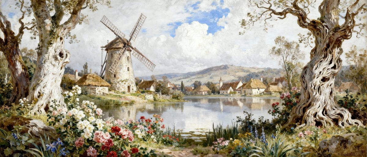 This image showcases a highly detailed oil painting of a village featuring a windmill, lake, and flowers. Rendered with rich textures and intricate detail, it evokes a sense of medieval beauty.