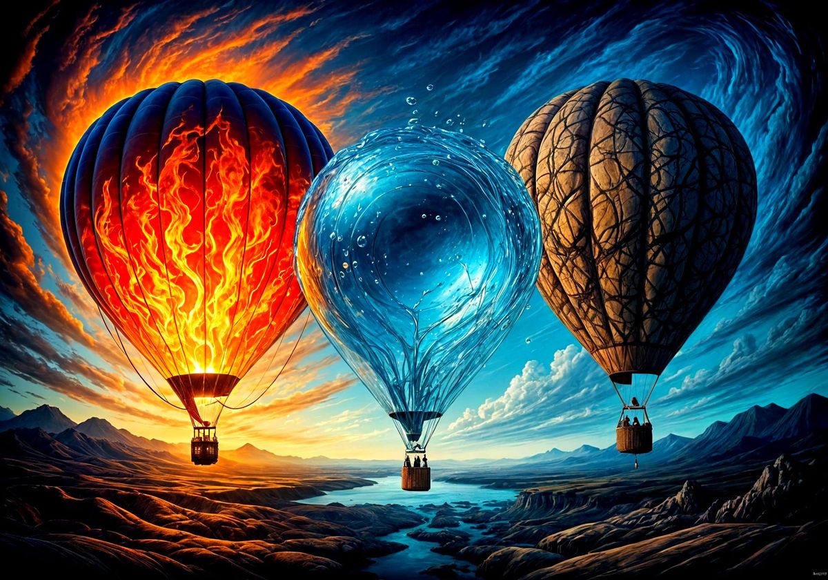 This image shows four hot air balloons representing earth, air, fire and water floating in a colorful sky. The surrealist digital art style is reminiscent of abstract expressionism.