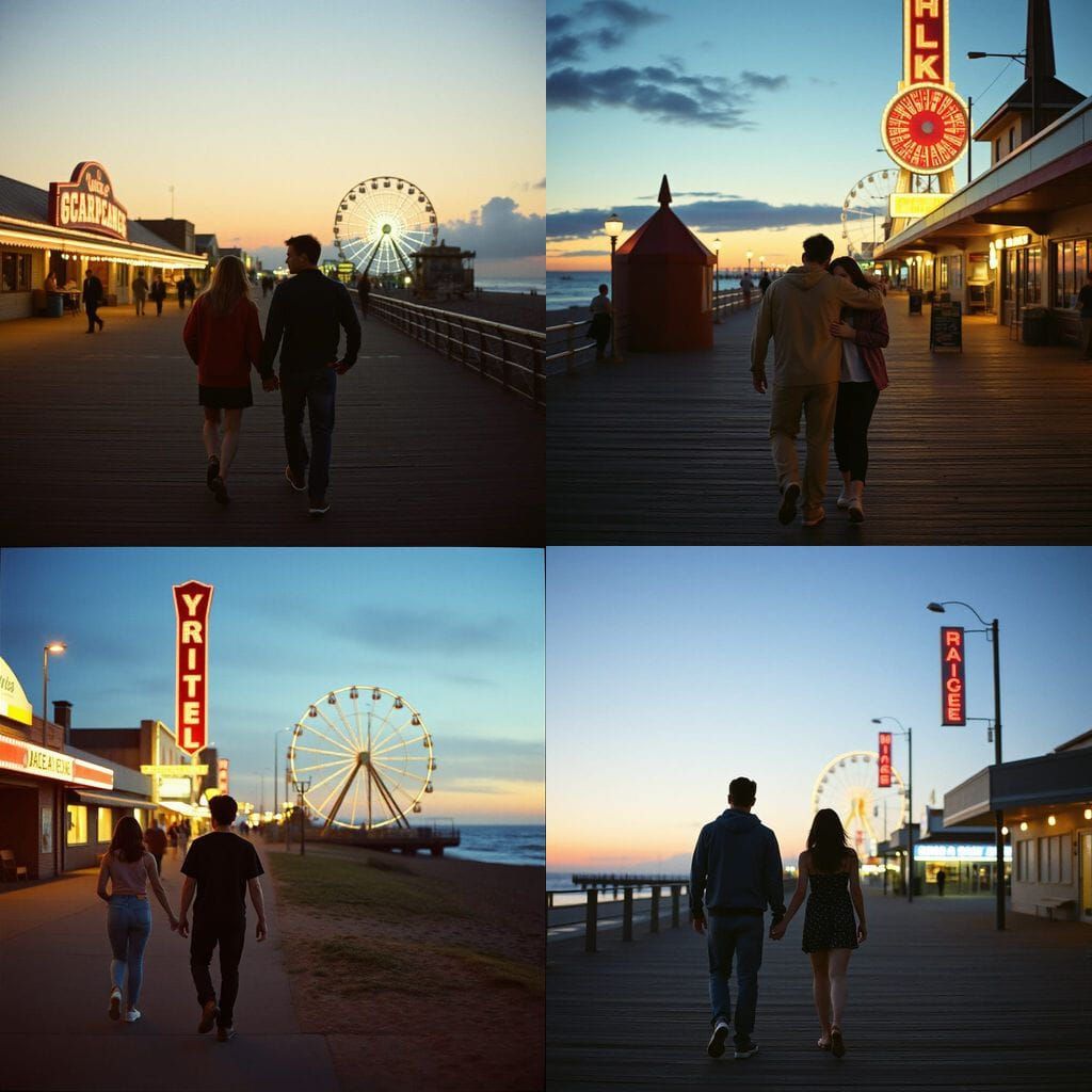 This image shows a young couple walking on a boardwalk at sunset. The boardwalk is lit by glowing signs and a distant Ferris wheel, creating an atmospheric, cinematic scene.