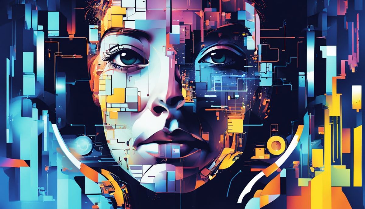 This image shows a close-up portrait of a futuristic woman in a neon-lit cityscape. Intense digital glitch effects create fragmentation, color shifts, and visual noise in a cyberpunk aesthetic.
