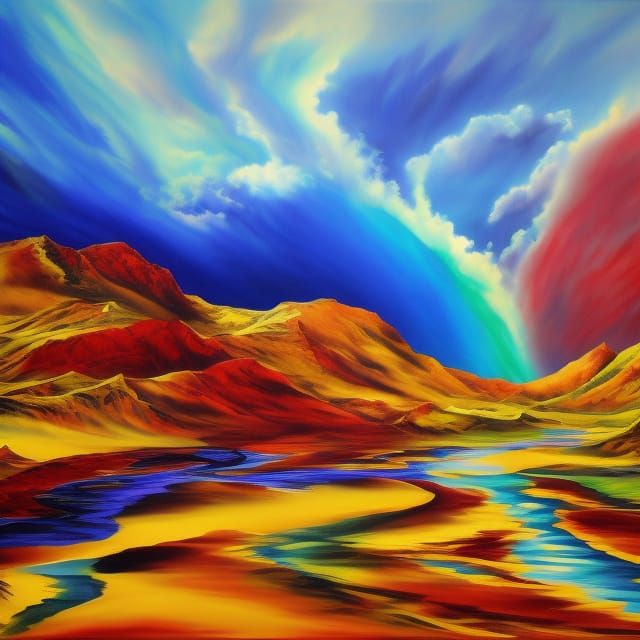 This image shows a mystical portal with swirling blue energy, set against a backdrop of majestic mountains and dramatic clouds. The artwork is rendered with hyperrealistic detail and triadic colors.